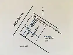 The front of the house has a pitched roof with the ridge parallel to the front of the house (approximately northeast – southwest). Roof ridge lines are in blue dashes in the layout diagram. The former school room is behind the front rooms and takes the entire width and height of the building, with a second roof ridge being almost the same height as the ridge of the roof over the front rooms, but is perpendicular to the front ridge, therefore approximately north west – south east. The ridge for the roof of the school room is located approximate one third along the width of the building, closest to the southern end of the school room. This means the school room has a very high ceiling (two storeys plus attic at the ridge point). Within the vaulted ceiling the wooden roof joists and trusses become a feature of the room. From the ridge the ceiling followed the roof line downwards until it met the external walls, at a height of approximately four metres (13 ft) on one side and two metres (6 ft 7 in) at the rear of the school room (north side of the building). This gave the rear of the building an asymmetric gable end view.
