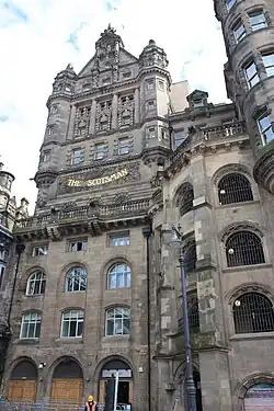 In 1860, The Scotsman obtained its own purpose built office on Cockburn Street in Edinburgh designed in the Scots baronial style by the architects Peddie & Kinnear.[12] This backed onto their original offices on the Royal Mile. The building bears the initials "JR" for John Ritchie, the founder of the company. On 19 December 1904,[13] they moved to much larger new offices at the top of Cockburn Street, facing onto North Bridge, designed by Dunn & Findlay (Findlay being the son of the then owner). This huge building had taken three years to build and also had connected printworks on Market Street (in 2024 the City Art Centre). The printworks connected below road level direct to Waverley station in an efficient production line.