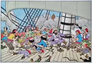 While Tintin is out, the ship is stolen from his apartment; in the following investigation, he discovers that Sakharine owns an identical model, also named the Unicorn. At home, Tintin discovers a miniature scroll, and realises that it must have been hidden inside the mast of the model. Written on the parchment is a riddle: "Three brothers joined. Three Unicorns in company sailing in the noonday sunne will speak. For 'tis from the light that light will dawn, and then shines forth the Eagle's cross".[1] Captain Haddock vividly recounts the tale of the Unicorn, a 17th-century warship captained by his ancestor, Sir Francis Haddock, but seized by a pirate band led by Red Rackham. In a retold flashback, it is shown how Francis' ship is attacked by Red Rackham and his crew. At first the pirates raise the black Jolly Roger, indicating that quarter (safe conduct) is offered in exchange for peaceful surrender, but when Francis refuses to strike his flag and bombards the pirates with cannon fire, the pirates instead "hoists fresh colors" and raise the "red pennant" (a bloody flag, French: pavillon sans quartier), signaling no quarter (no mercy, no prisoners), after which they board Francis' ship and massacre his crew.[2] The only one of his crew to survive the boarding, Sir Francis killed Red Rackham in single combat and scuttled the Unicorn; he later built three models, which he left to his sons.