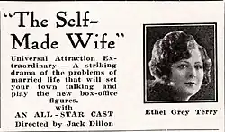 The Self-Made Wife is a 1923 American silent melodrama film, directed by John Francis Dillon. It stars Ethel Grey Terry, Crauford Kent, and Virginia Ainsworth, and was released on July 8, 1923. It was written by Albert G. Kenyon based upon the short story "The Self-Made Wife" by Elizabeth Alexander.[2]