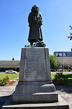The Sentinel is an 8 foot (2.4 metres)[b] tall cast bronze sculpture of a World War I doughboy atop a granite base.[9][2] Unmodified since its placement in 1924, the artwork faces east. Over time, based on a form of transmutation, the statue has been described as taking on the likeness of Wesley Everest, the lynched Wobbly from the riot, but the NRHP form does not confirm the idea.[2]