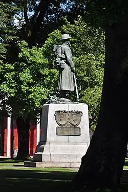 The Sentinel is comparable to Lewis's Seattle doughboy sculpture in which both infantrymen are depicted with a helmet, rifle, and bandolier. Differences include the Sentinel's bayonet on the rifle which is folded into the gunstock and the position of the rifle, which on the Sentinel stands in front of the soldier, clasped in his hands. Additionally, the Sentinel soldier is wearing a great coat, with the collar of the trench coat turned upwards as if protecting the infantryman from the weather.[4][17] The most visible difference is the manner and movement of the two artworks. The Seattle doughboy is a smiling soldier, walking in stride as opposed to the Sentinel likeness, which is devoid of movement or a positive manner. The Sentinel is described as either standing at attention[9] or at a position of guard duty.[4] The engraving at the base of the statue mentions the soldier as a "sentry at his post".[17]