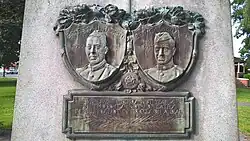 On the left flank of the pedestal is a bronze bas relief with an American Legion insignia containing the portraits of Arthur McElfresh and Warren Grimm, two legionnaire members who died during the Armistice Day Riot. A bronze plaque reads:[2]