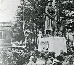 The dedication was held on Armistice Day, November 11, 1924,[9] the day considered to be a deliberate act by the American Legion, and was attended by as many as 10,000 people.[10] Described as full of "pomp and symbolism", further reports mention that the ceremonies went beyond the memorialization of the legionnaires. The American Legion held its national convention in Centralia at the time and a parade, marking the exact same route as during the 1919 events, took place without incident even as the parade traveled past a new IWW hall.[2] Major General Ulysses Grant McAlexander, known as the "Rock of the Marne", delivered the official memorial address.[6][11] Several dignitaries spoke, including Lewis and state governor Louis F. Hart, and messages were sent from international figures, such as French Marshall Ferdinand Foch. A telegram was sent by President Calvin Coolidge in recognition of the dedication.[12]
