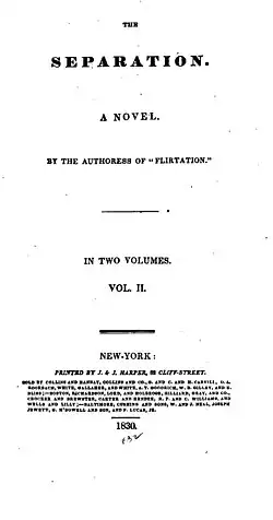 The Separation is an 1830 novel by the British writer Lady Charlotte Bury, published in three volumes.[1] It falls into the tradition of silver fork novels, popular at the time.[2] It was published in New York City by Harper the same year in two rather than three volumes. It was published anonymously, although Bury's authorship was widely known. A reviewer attacked it for recycling the plot entirely from Bury's 1812 novel Self-indulgence, although the resulting publicity seemed to help the novel's sales.[3]
