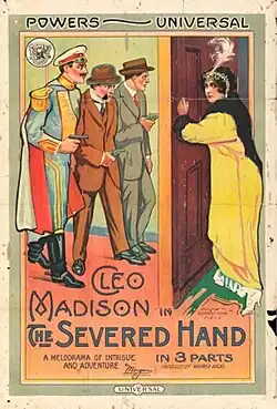 The Severed Hand is a 1914 silent short drama film directed by Wilfred Lucas and starring Cleo Madison, George Larkin and Edward Sloman. It was produced by Powers Picture Plays and distributed through Universal Film Manufacturing Company.[1][2][3]