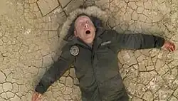 The episode's flashforwards commence with Ben waking up alarmed in the Sahara with a wounded right arm and vapor rising from him. The Dharma Initiative parka that he wears was codenamed "Dharka" by the writers.[28] A couple of Easter eggs are present in this scene:[29] Ben's parka has a name tag that indicates that it was formerly owned by Edgar Halliwax (François Chau) and it displays the first appearance of the logo for a Dharma station called the "Orchid" that would not be seen until the episode titled "There's No Place Like Home".[30] Another Easter egg is glimpsed in the next scene, when Ben reveals his forged Canadian passport previously seen in "The Economist" for his alias Dean Moriarty,[31] which is also the name of the central character in Jack Kerouac's 1951 novel On the Road.[32] Among the most frequent questions that the writers are asked is whether they have planned out future storylines,[33] so the writers try to allude to future plot points, such as with the Dharka scene, that they can later call on as proof that they do know where the story is headed.[21] Director Jack Bender described the scene, which was filmed in a Hawaiian rock quarry, as especially hard to shoot because the actors had to ride horses and use guns, the crew had to relocate due to rocks present that were unsuitable for the scene, and Bender walked head-first into a crane.[34] Emerson stated that the set is "definitely a no-glamour zone ... I thought we would ease into things. Instead, I get this all-Ben extravaganza: combat, riding horses, foreign languages. And piano playing! All waaaay outside my comfort zone. How can you work two weeks and feel like you need a vacation already?"[35]