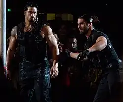 The Shield[7] was a professional wrestling stable in WWE that consisted of Dean Ambrose, Roman Reigns, and Seth Rollins.[8] The group debuted on November 18, 2012 at the Survivor Series pay-per-view.[5] The Shield was a dominant force in six-man tag team matches with an undefeated televised streak lasting from December 2012 to May 2013, during which they scored a victory at WrestleMania 29. In May 2013 at Extreme Rules, all three members of The Shield won a championship, with Ambrose winning the United States Championship while Rollins and Reigns captured the WWE Tag Team Championship. Rollins and Reigns were WWE Tag Team Champions until October 2013, and Ambrose was United States Champion until May 2014, which was a record reign for the WWE version of the championship.[9][10] As a Shield member, Reigns gained prominence by setting and equaling elimination records at the 2013 Survivor Series and the 2014 Royal Rumble events.[11][12]