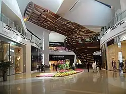 Rockwell's design includes a grand staircase,[18] and features an indoor park theme in some areas, including hanging gardens and a 70-foot wooden treehouse structure serving as a concierge desk and restaurant seating area.[4][5] The interior also has a flower carpet that is changed regularly based on the seasons. It was inspired by the Flower Carpet event in Brussels.[18] Ceilings reach up to 120 feet in some areas of the mall. Because of this, catwalks were built in four locations around the mall to aid in lighting maintenance.[19]