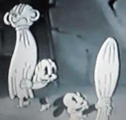 The wolf is standing around, still trying to figure the whereabouts of his two would-be-victims. Just then, Oswald and the girl beagle, in their ghostly disguises, pass by. Not realizing it is them, the wolf asks the two for directions. They reply, saying they know nothing, and walk away. The disguises of Oswald and the girl beagle, however, fail to keep them covered for long as their backs are partially exposed. The wolf notices this and goes after them.
