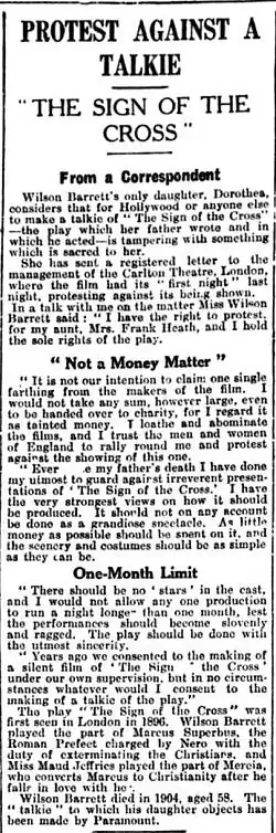 - ^ a b Protest Against a Talkie: "The Sign of the Cross", The Citizen, (Tuesday, 31 January 1933), p.8.