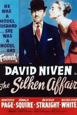 The Silken Affair is a 1956 British romantic comedy film directed by Roy Kellino and starring David Niven, Geneviève Page, Wilfrid Hyde-White, Joan Sims, Irene Handl and Ronald Squire.[2][3] The screenplay concerns an accountant who is creative with his firm's books and uses the money to fund a romantic spree.