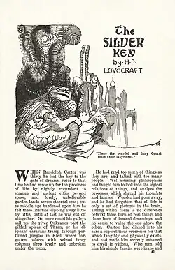 ![]() Title page of "The Silver Key" as it appeared in Weird Tales, January 1929. Illustration by Hugh Rankin.[1] | |