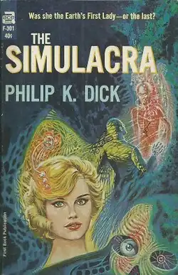 Dick originally published the story as a novelette in the magazine Fantastic, titled "The Novelty Act". He expanded the plot and titled the novel First Lady of Earth.[1] Before publication, the title was changed to The Simulacra. The novel was originally published in 1964 as a paperback by Ace Books.[2] It was one of four novels released by Dick that year.[3]