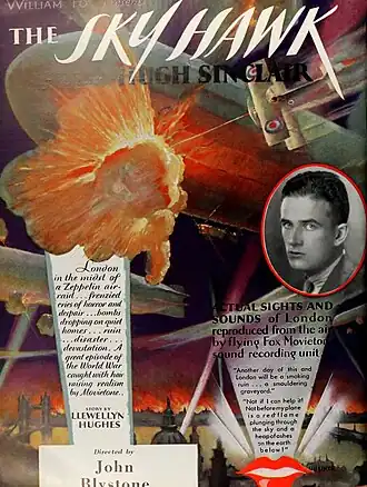 In a period when studios were adapting to the new "sound" technology, The Sky Hawk successfully utilized sound throughout the production. One of the most impressive aspects of the film was Special Effects Coordinator Ralph Hammeras creating a large-scale miniature of the city of London in the Fox Studios airfield hangar built for Hell's Angels (1930). Hammeras also created special mechanical effects, utilizing miniature aircraft and a model Zeppelin in the climatic Zeppelin raid sequence.[2] Blystone's brother Jasper was the assistant director on The Sky Hawk.[3]