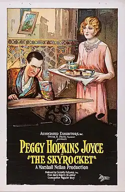 Director Marshall Neilan was announced by Photoplay as the director in July, 1925.[3] Peggy Hopkins Joyce was a one-time Ziegfeld Follies showgirl who became a media figure in the late 1910s and early 1920s for dating, marrying, and divorcing wealthy men, acquiring a sizable collection of expensive jewelry and furs and wearing fashionable clothes.[4] The Skyrocket was Joyce's first full-length feature and was intended as a vehicle to launch her acting career as she was largely known only for her colorful personal life. The film's distributor, Associated Exhibitors, launched a massive publicity campaign to promote the film.[5] While Joyce earned mainly positive reviews for her performance, the film barely earned back its budget in box office returns.[6] She would appear in only one more film, International House (1933), before fading into obscurity.[7]