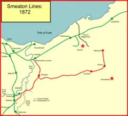 The North British Railway (Branches) Act 1862 (25 & 26 Vict. c. xlix) received royal assent on 3 June 1862; the lines were now described as the Monktonhall branch (from Smeaton to Monktonhall Junction); the Ormiston branch (from Smeaton to Macmerry); and the Dalkeith branch from Smeaton to Hardengreen Junction.[1][4][7] Smeaton was no more than a farmstead, but now it was to be the hub of these lines. The final part of the Ormiston branch, approaching Macmerry, ran alongside an earlier tram road that ran from Pencaitland Colliery to the coast. The Dalkeith branch included the obligation to acquire the Duke of Buccleuch's tramway, and it may be that the original intention was simply to upgrade parts of it. There was some delay before work started, possibly because of negotiations with Buccleuch and a possible redesign, but in 1865 construction started; this included a new bridge structure over the South Esk.