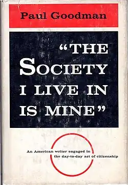 The Society I Live in Is Mine is a collection of social commentary ephemera by Paul Goodman, including both published and unpublished letters to the editor, essays, and speeches from newspapers and magazines. Much of the content addresses the general public[3] with the intention of urging readers to become more alert and intervening citizens, using his own actions as an example.[4] Goodman describes the collection as "angry letters on public morals and politics"[5] written to "influence the general consensus".[4] He expresses dismay that so few people consider themselves citizens, instead viewing society as a machinery of authorities in which they merely participate. Goodman intends to demonstrate that by making their voices heard, people can more fully participate in and enjoy their society.[6] He posits that a multitude of authentic, concerned citizens is the solution for a society dulled by standardization, neglect, and injustice.[1]