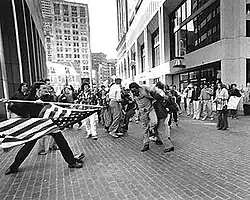 The Soiling of Old Glory is a Pulitzer Prize–winning photograph taken by Stanley Forman during the Boston desegregation busing crisis in 1976.[1] It depicts a white teenager, Joseph Rakes, assaulting a black man—lawyer and civil rights activist Ted Landsmark—with a flagpole bearing the American flag (also known as Old Glory).