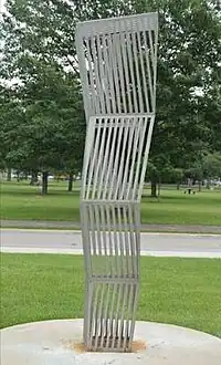 The South Tower is an abstract, frosted stainless steel aluminum rectangular sculpture.[4] Measuring 10 ft x 3 ft x 2 ft, the structure is vertically-louvered and is depicted as coming apart at the top.[3] The grate-like design of each section is carried through the sculpture creating a leaning, S-shaped structure.[5] Each section is composed of 11 straight bars of aluminum. Four bolts secure the artwork to the circular concrete base.[6] It is signed "Don Gummer 2008" on the front of the artwork, at the top of the bottom element.