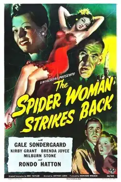 The Spider Woman Strikes Back is a 1946 American horror film starring Gale Sondergaard, with a running time of 59 minutes. Despite the similar title and role played by Sondergaard, the film is not a sequel to the Sherlock Holmes film The Spider Woman. In The Spider Woman, Sondergaard's character is named Adrea Spedding.[1] This time it is Zenobia Dollard.[2][3]