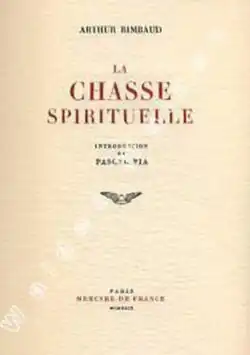 The Spiritual Hunt (French: La Chasse spirituelle) is a prose poem purportedly written by French writer Arthur Rimbaud, claimed to be his masterpiece by his friend and lover Paul Verlaine.[1] Supposedly strongly resembling in form the only book he published during his lifetime, A Season in Hell, the poem is considered to be one of the most famous lost artworks, despite the fact that in 1949, a twelve-page[2] work by the same title was unveiled to the public by Pascal Pia; Rimbaud scholars, almost unanimously, have denounced this poem as a literary forgery.