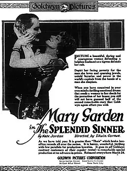 The Splendid Sinner is a 1918 American silent World War I drama film directed by Edwin Carewe and starring Opera star Mary Garden. It was produced and released by Goldwyn Pictures.[1][2]