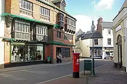 The Square has six listed building entries. On the north side, numbers 5 and 7 make up one entry and number 1 forms a separate entry, and in a courtyard set back from the square, Castle Cottage, and the cottages adjoining it are considered two entries.[1][2][3][4] On the south-east side, the Town Hall and London House are both individually listed.[5][6] Castle Cottage is reckoned by English Heritage to be the oldest of the six, and is described as being 17th century, although it was refronted in the 19th century. It is a Gothic, two storey, timber-framed cottage with a slate roof.[3] The adjoining cottages are from the late 18th century, but now provide stores for number 1, rather than accommodation.[4] Number 1 is more recent, being from the early 19th century, but with a 20th-century shop-front.[2] Numbers 5 and 7, which is the only Grade II* listed building on The Square, was originally a bank and house, dating from 1881, but now serves as a shop and the library. English Heritage describe it as being of the Norman Shaw style. It has three storeys, of which the upper two are fronted with a pattern tile-hanging, while the ground floor is red sandstone. The building has wooden casement windows, some of which project from the walls, with decorative wooden panels beneath. It has a large double wooden door in an arch, which was the entrance to the bank, now the library.[1]