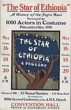 The Star of Ethiopia is an American historical pageant written by leading New Negro intellectual W. E. B. Du Bois in 1911. Outlining the history of African Americans throughout time, pageants were held in high regard by Du Bois who felt that Pageants could be utilized best as a form of educational theatre, or as an instructional tool to not only teach African Americans the meaning of their history, but also enlighten whites as to "reveal the negro...as human."[1] Despite his minimal experience in playwriting, Pageant Movement intellectual Du Bois composed and constructed for the stage The Star of Ethiopia to be presented as an American historical pageant.