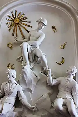 It has been surmised that one explanation for the scepticism of these last two fables was that Hermes was the god of trade and merchants and the Greeks had a certain ambivalence towards wealth making.[29] The 10th century Byzantine Greek lexicon known as the Suda explains what form of statue is involved here. "They say Hermes was responsible for profit and an overseer of the businesses: consequently they set up the statue of him weighing a purse."[30] It is to such sculptures that the statue on the stairs of the Winter Palace of Prince Eugene in Vienna can be referred, although it is itself ambiguous. The sculptor rests with chisel in hand on the statue's right as it looks down towards another similarly dressed individual on the other side who raises his hand towards the god. It might therefore remind viewers of the first of the fables here, which was well known. However, it is the purse held well away in the god's right hand which seems to be drawing the gaze of the man below, whose hand is cupped as if in supplication. The statue can therefore be read alternatively as referencing either of the last two fables here.