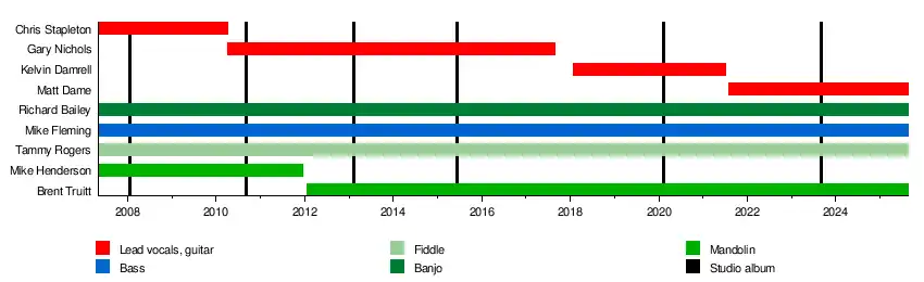 Stapleton announced in April 2010, that he was leaving the band to focus on raising his family.[6] He was replaced by former Mercury Records artist Gary Nichols on lead vocals and guitar.[7] In December 2011, founding member Mike Henderson left the band.[8][9] Henderson was replaced by Nashville musician and record producer Brent Truitt. In 2015, the new lineup received a Grammy Award for Best Bluegrass Album for its new album The Muscle Shoals Recordings.[10] In 2018, Kelvin Damrell became the band's new lead singer and debuted on the 2020 release Bad for You.[11] In July 2021, Damrell announced his departure from the band, with the band simultaneously announcing the addition of Matt Dame as lead singer.[12]