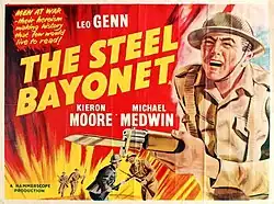 The Steel Bayonet is a 1957 British war film directed by Michael Carreras and starring Leo Genn, Kieron Moore and Michael Medwin.[3] Michael Caine also had a small role in the film, early in his career. It is set during the Second World War, in the Tunisian desert when a small British observation force are surrounded in a farm by overwhelming forces of the German Afrika Korps. Filming took place on Salisbury Plain, which doubled for North Africa. This was Michael Carreras' first film he directed for Hammer. Phil Leakey did Makeup and Sid Pearson did Special Effects. The film's original working title was Observation Post. The German soldiers actually spoke German (with English subtitles) in the film, which was unusual for its time. Filming wrapped on Sept. 20, 1956, it was trade shown in London on May 14, 1957, and released on June 3, 1957. It was released in the US in 1958 on a double bill with a Forrest Tucker western called Fort Massacre.[4]