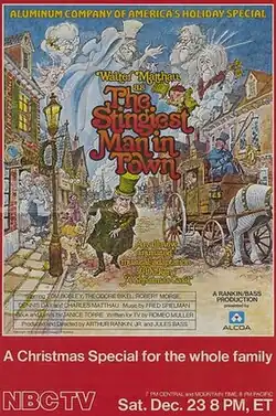 The Stingiest Man in Town is a 1978 animated Christmas musical television special based on Charles Dickens's 1843 novella A Christmas Carol.[1] It was created by Arthur Rankin Jr. and Jules Bass, and features traditional animation rather than the stop motion animation most often used by the company.[2] It was an animated remake of a long-unseen, but quite well received, live-action musical special (also called The Stingiest Man in Town) which had starred Basil Rathbone, Martyn Green and Vic Damone. The live-action version had been telecast on December 23, 1956, on the NBC anthology series The Alcoa Hour, and was released on DVD in 2011 by VAI.[3] The animated remake first aired December 23, 1978, in the United States on NBC, and was telecast in Japan the next day.