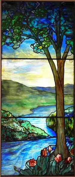 The Sunset Scene[1] is a window glass artwork created by Tiffany Studios around 1915. This artwork was created to symbolize the distinct line between life and death. Tiffany Studios manufactured many stained glass pieces, the scene was one of a couple of windows created for Mount Hope Cemetery[2] in Rochester New York. Many of these window pieces have been created in relation to religion and personal interior home decor and other decorating purposes.