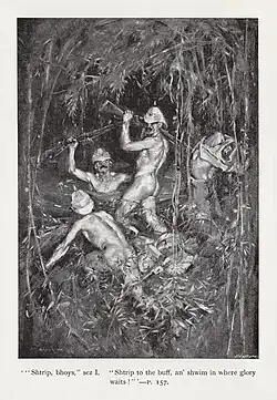 After reinforcements arrive, the British – still naked from their swim – go in with bayonets and the butts of their rifles, as well as their ammunition. They kill 75 Burmese. They then hold "the most ondasint p'rade [= 'indecent parade'] I iver tuk a hand in", with only eight men having even belt and pouches on; the rest are "as naked as Venus". While half of them dress, the other half patrol the town, with the women laughing at them.
