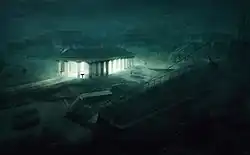 Altberg, alone at last, drifts for a couple more days before his U-boat finally lands on the ocean floor, where he is amazed to see the sunken remains of an ancient and elaborate city. Deciding that it is the ruins of Atlantis and overcome with excitement, Altberg dons a deep-sea diving suit, exploring the breathtaking, indescribable beauty of the ruined city and discovering a mysterious rock-hewn temple, amazed to find the image of the ivory carving within. He spends the next couple of days in darkness as the sub's last reserves of battery power and air are expended. In the end, he acknowledges that even with his mighty "German will", he is no longer able to resist the powerful visions and auditory hallucinations, nor his madness-inspired impulse to depart his U-boat and enter the temple, now impossibly illuminated by what seems to be a flickering altar flame. Slipping on his diving suit, he releases his sealed manuscript in a bottle (which is later found on the coast of Yucatan), and goes willingly to his death.