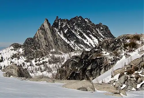 The Temple[3] is an 8,295-foot (2,528-metre) granite mountain summit located in Chelan County of Washington state. The Temple is part of The Enchantments, set within the Alpine Lakes Wilderness. The Temple belongs to the Stuart Range which is a subset of the Cascade Range. The nearest higher peak is Enchantment Peak, 1.55 miles (2.49 km) to the west, and the nearest town is Leavenworth, 8 miles (13 km) to the northeast. The mountain hosts many granite spires with names like The High Priest, The Boxtop, Flake Tower, Comet Spire, Razorback Spire, The Meteor, The Professor, Lighthouse Tower, Black Pyramid, and the most recognizable Prusik Peak. The highest point of the mountain is called Mt. Temple.[4] Precipitation runoff from the mountain drains into Snow Creek which is a tributary of Icicle Creek.