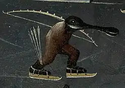 Some motifs have several potential meanings. The roasted bird has two potential meanings in regard to symbolism in this painting. The first is as a symbol of gluttony and the second is alluding to sexual acts.[3] Similarly, the goat hoof which lays in front of the spoon-billed creature also has multiple meanings. This hoof is a stand in for a full goat which in Bosch's work and across Flemish Renaissance art represents both merrymakers and inappropriate sexuality.[3] This is demonstrated in other paintings depicting the temptation of St. Anthony where she-goats are taunting St. Anthony as women ride them.[3]