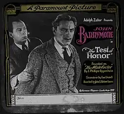 The Test of Honor (1919) was an American silent film drama produced by Famous Players–Lasky, released by Paramount, directed by John S. Robertson, and starring John Barrymore. Considered the actor's first drama movie role after years of doing film comedies and farces. It is based on author E. Phillips Oppenheim 1906 novel The Malefactor.[1]