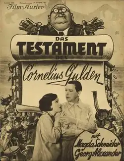 The Testament of Cornelius Gulden (German: Das Testament des Cornelius Gulden) is a 1932 German drama film directed by E. W. Emo and starring Magda Schneider, Georg Alexander, and Theo Lingen.[1] It is based on the 1930 novel of the same title by Ludwig von Wohl.