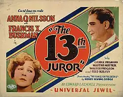 The Thirteenth Juror is a 1927 American silent mystery film directed by Edward Laemmle and written by Charles Logue and Walter Anthony. It is based on the 1908 play Counsel for the Defense by Henry Irving Dodge. The film stars Anna Q. Nilsson, Francis X. Bushman, Walter Pidgeon, Martha Mattox, Sidney Bracey and Sailor Sharkey. The film was released on November 13, 1927, by Universal Pictures.[1][2][3]