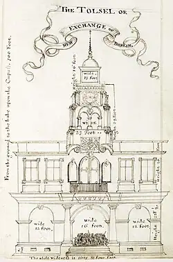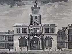 The last tholsel building was completed around 1681 and was finally occupied by Dublin Corporation and the Merchants' Guild in 1682.[10][11] It is unknown who designed the building although various masons including a William Rothery are recorded as having worked on it at various stages.[12] In 1683, the exchange of Dublin was transferred from Cork House to the tholsel.[13]