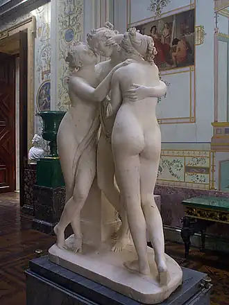 Antonio Canova's statue The Three Graces is a Neoclassical sculpture, in marble, of the mythological three Charites, daughters of Zeus – identified on some engravings of the statue as, from left to right, Euphrosyne, Aglaea and Thalia – who were said to represent mirth (Euphrosyne), elegance (Aglaea), and youth/beauty (Thalia).
