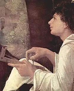 The Three Philosophers was finished around 1509, and the current name of the work derives from a writing of Marcantonio Michiel (1484–1552), who saw it just some years after in a Venetian villa.[5] The three figures portrayed are allegorical: an old bearded man, possibly a Greek philosopher; a Persian or Arab philosopher; and a sitting young man, enclosed within a natural landscape.[6] In the background is a village with some mountains, the latter marked by a blue area whose meaning is unknown. The young man is observing a cave on the left of the scene, and apparently measuring it with some instruments. Since the end of the 19th century scholars and critics rejected on various grounds the earlier view that it is a representation of the three Magi gathered before Jesus' grotto.[7][8][9]