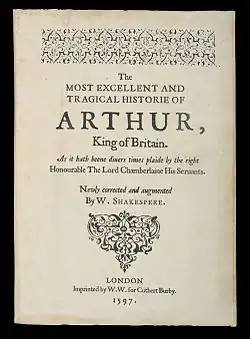 The Most Excellent and Tragical Historie of Arthur, King of Britain (more widely known as The Tragedy of Arthur) is a play, represented as having been written by William Shakespeare, uncovered in 2010 by Arthur Phillips. The first edition of it was published in 2011 by Random House.[17] It tells the story of the legendary King Arthur, who is described in the Introduction to play's first edition by Phillips as "a charismatic, charming, egocentric, short-tempered, principled but chronically impulsive bastard."[18] The play narrates his victories and failures as King of Britain.