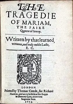 ![]() Title page of Elizabeth Cary's The Tragedy of Mariam. | |