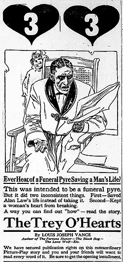 The Trey o' Hearts is a 1914 American 15-chapter action film serial directed by Wilfred Lucas and Henry MacRae. It was written by Allan Dwan and Bess Meredyth, based on a story of the same name by Louis Joseph Vance. The first chapter ran 3 reels, while the others were two-reelers. The film is currently considered to be lost. Some sources list Lon Chaney in the cast (uncredited), but this is disputed and unconfirmed.[1][2]