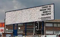 The Trillion Dollar Campaign was launched in March 2009. Banknotes of denominations between Z$1,000,000 and Z$100,000,000,000, each bearing one of four English-language advertising slogans, the website address for The Zimbabwean, its logo, and its tagline "A voice for the voiceless", were handed out to motorists stopped at busy intersections in Johannesburg.[3] Rolls of the altered currency were mailed to industry figures, media personalities, and politicians. Posters were put up at every location selling copies of the newspaper in the city, murals 1.5 m (4.9 ft) tall by 5 m (16 ft) wide[9] were pasted across walls along streets with heavy foot traffic, and billboard spaces were purchased overlooking several highways. All were composed of hundreds or thousands of banknotes, which could be detached and taken home by members of the public.[3][6] The four slogans used in the campaign were "Fight The Regime That Has Crippled A Country",[10] "It's Cheaper To Print This On Money Than Paper",[11] "Z$250 000 000 Cannot Buy The Paper To Print This Poster On",[12] and "Thanks to Mugabe This Money Is Wallpaper".[13]