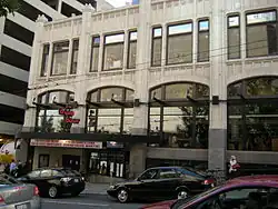 The Triple Door is located on Union Street in the Mann building, the former home of the Embassy Theatre which was established as a movie theater when it opened in 1925.[4] The Embassy Theatre maintained its title as an A-list theatre well into the fifties but slowly lost popularity in the sixties.[5] In 1984 the extremist group The Order set off a pipe bomb in the Embassy as a diversion for robbing an armored car at the Northgate Mall.[6] The Embassy Theater closed in 1984.[7] The building was bought in 1999 by Rick and Ann Yoder, and renovations to improve the quality of live performances began in the fall three years later.[7] In September 2003, The Triple Door opened the doors to their first show where Skerik's Syncpated Taint Septet performed and recorded their live album (which was released 7 years later).[8] The venue quickly rose in popularity and hosted shows for bands in the lounge (known as the "Musicquarium") such as Ottmar Liebert, The Courage, Natacha Atlas, Bassekou Kouyate, The Unthanks, Katie Herzig, Greg Dulli, Alyse Black, Edwin McCain, and El Vez.[9]