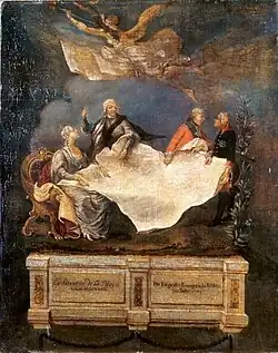 The Troelfth Cake (also The Twelfth Cake, The Royal Cake, The Cake of Kings, from the French: Le gâteau des rois, Polish: Kołacz królewski, Placek królewski) is a 1773 French allegory and satire on the First Partition of Poland.[1] It is likely that the original title in English was intended to say "The Twelfth Cake", alluding to the division of a three kings cake (also called a Twelfth Cake), but this became corrupted in later reprints.[1] There are at least four variants of the composition, which is most common as an engraving, but also as at least one color painting; the original was likely drawn by Jean-Michel Moreau le Jeune and engraved by Noël Le Mire (although another source calls them merely the authors of the most famous variant).[1][2][3] Authors of other variants included the German artist Johannes Esaias Nilson.[4]
